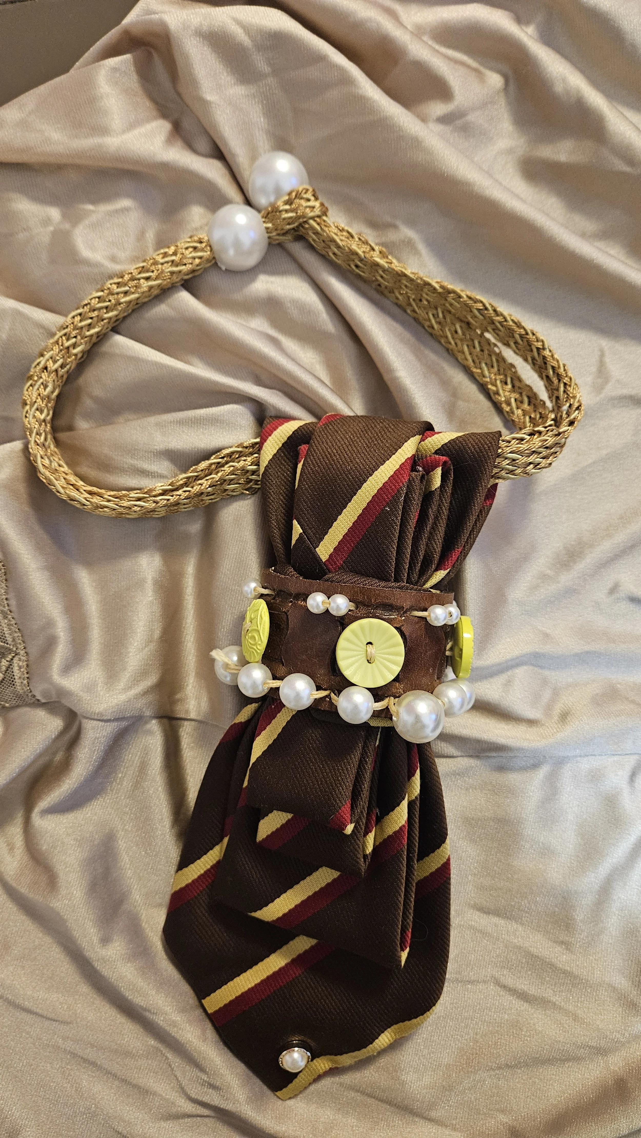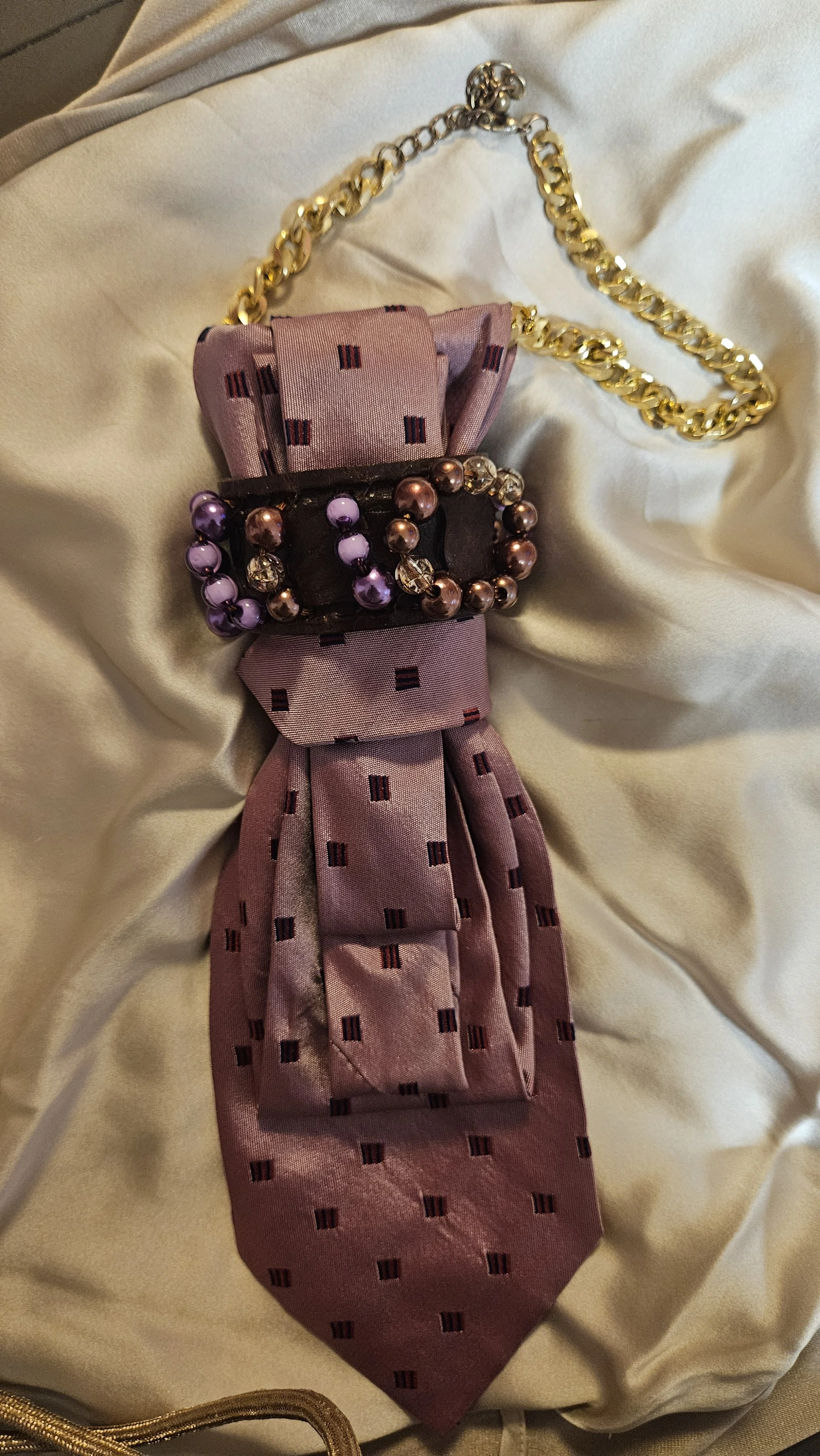 Questa cravatta-gioiello è un pezzo nato dal recupero di una cravatta vintage in pura seta color malva con micro geometrie bordeaux e da un coprinodo artigianale realizzato con il recupero di una polsiera anni ’90 in pelle ricamata a mano successivamente con perle. Il coprinodo può essere indossato come bracciale artistico, rivelando all’interno una frase motivazionale a sorpresa, diversa per ogni pezzo.