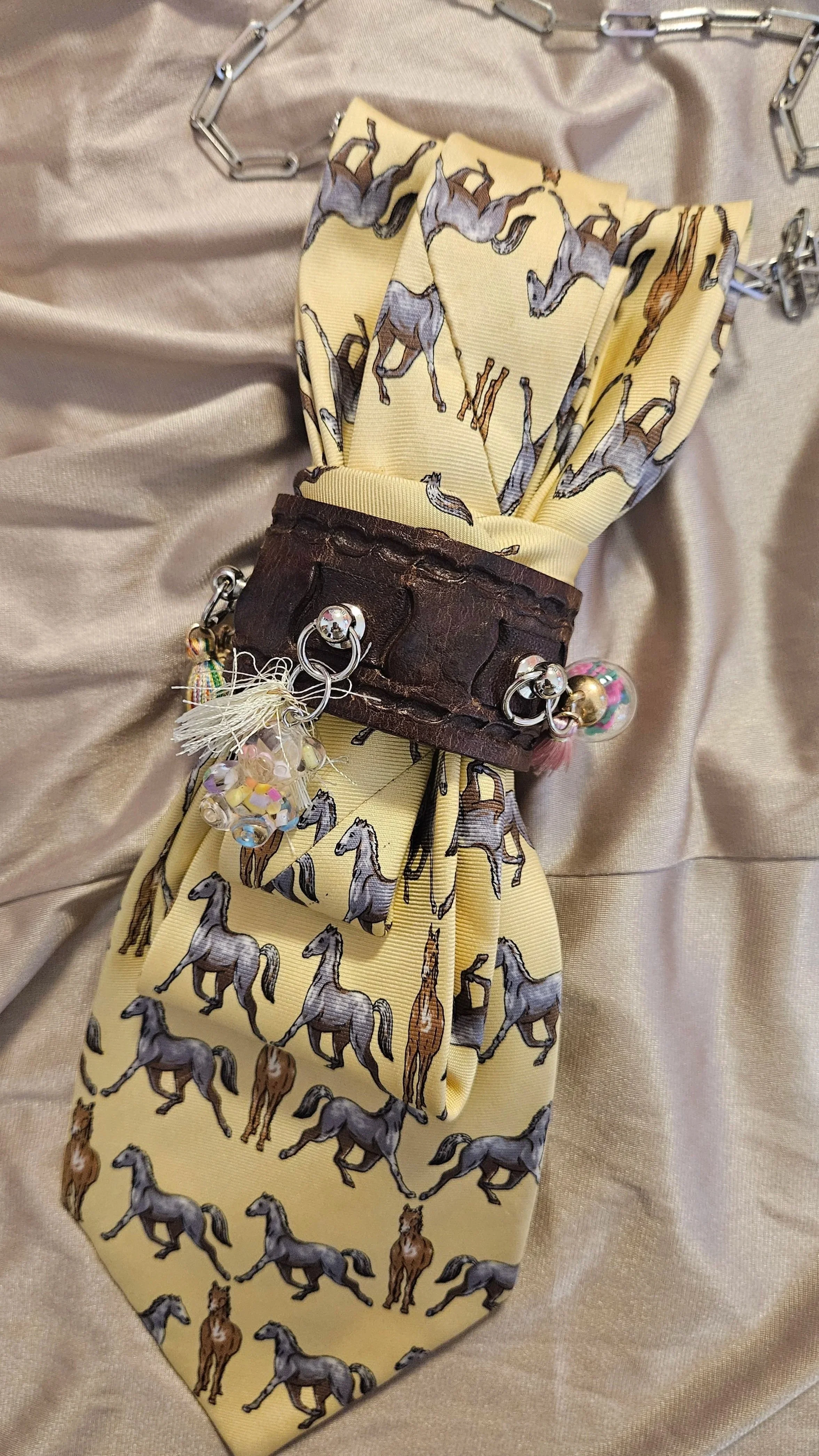 Un pezzo unico creato per chi vive con spirito libero. La cravatta-gioiello nasce da una cravatta vintage in pura seta gialla con stampa di cavalli al galoppo — simbolo di forza, indipendenza e autenticità — unita a un coprinodo artigianale ricavato da una polsiera anni ’90 in pelle ricamata con charms e borchie. Il coprinodo può essere indossato anche al polso come bracciale, rivelando al suo interno un messaggio segreto di empowerment personale.