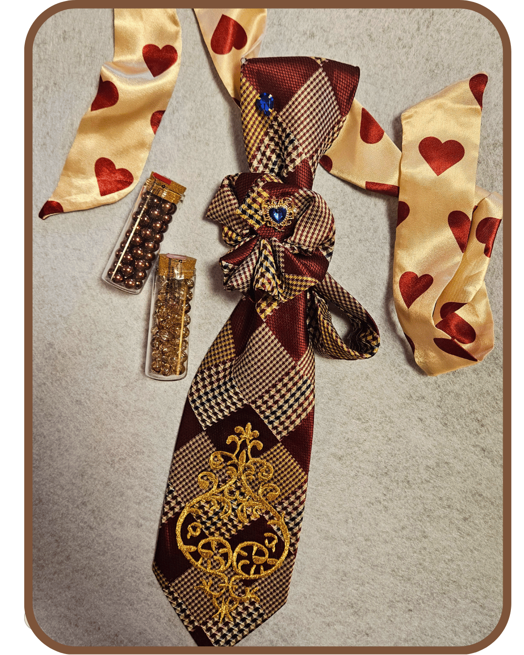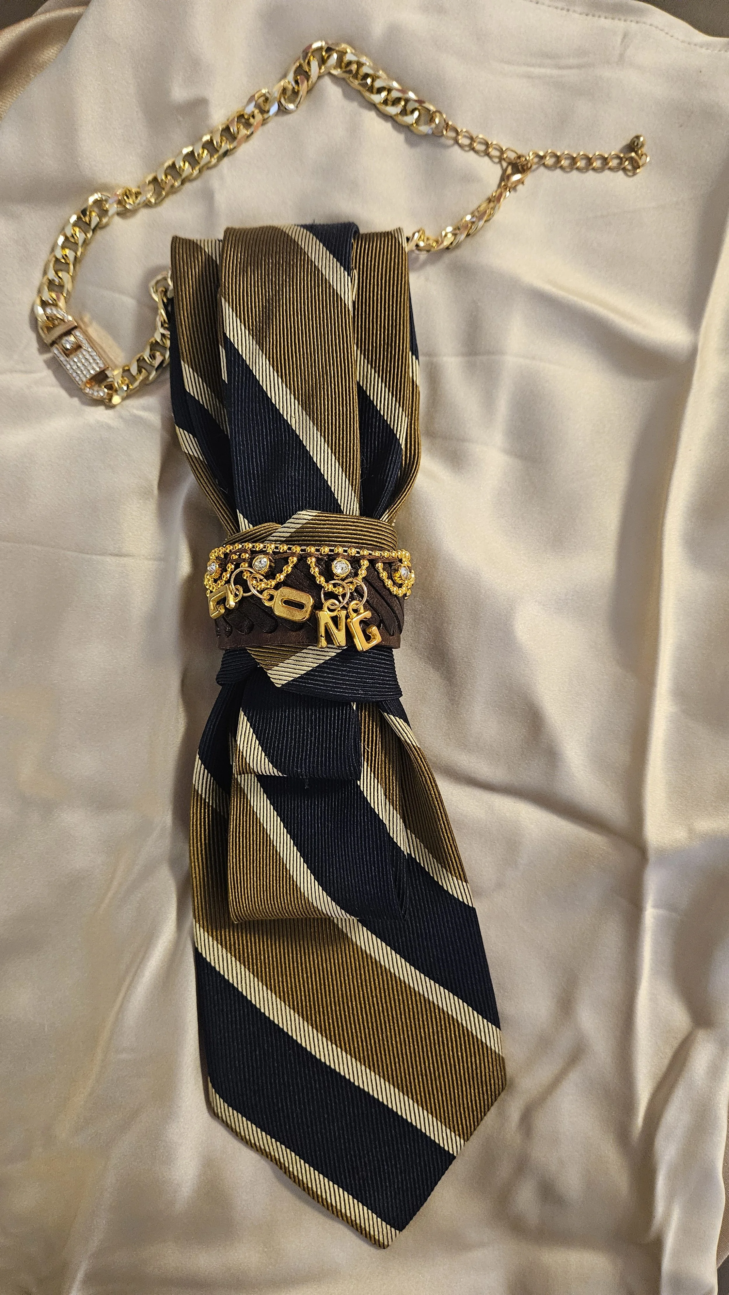 Questa cravatta-gioiello nasce dal recupero di una cravatta vintage in seta dalle righe color oro, bronzo e blu notte, abbinata a un coprinodo realizzato a partire da una polsiera anni ’90 in pelle, ricamata con passamaneria in perline e charms lettering. Il coprinodo si trasforma in bracciale motivazionale, con all’interno una frase a sorpresa, pensata per ispirare chi lo indossa.