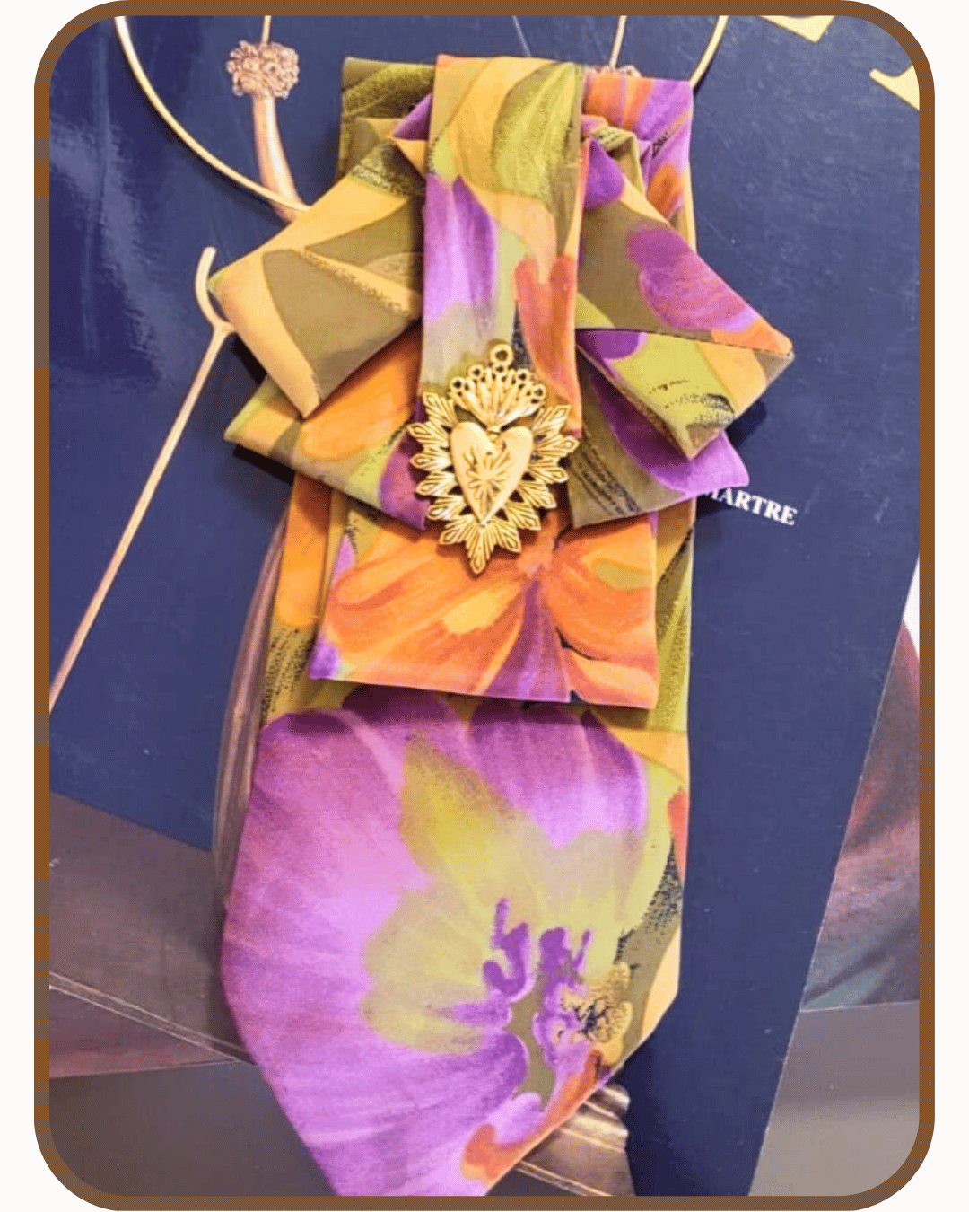 Cravatta in pura seta anni ‘70 con collana morbida, accorciata con pieghe e arricchita con spilla a cuore fatta a mano con elementi di recupero e strass.