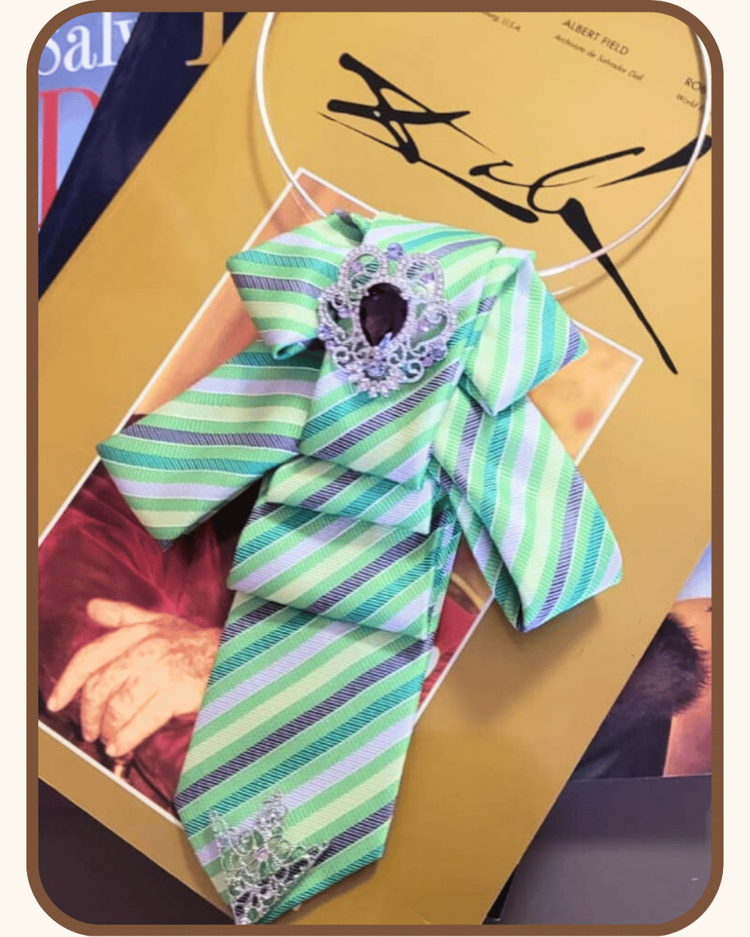 Cravatta in poliestere anni ‘90 rimodellata e accorciata con spille in stile barocco e collana rigida.