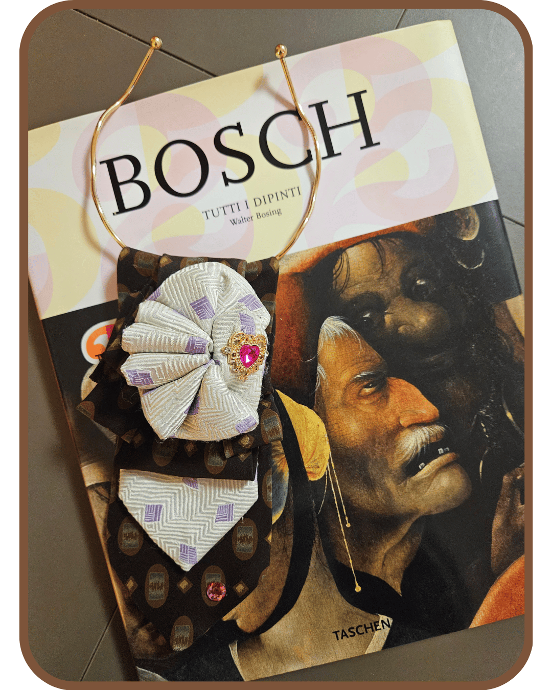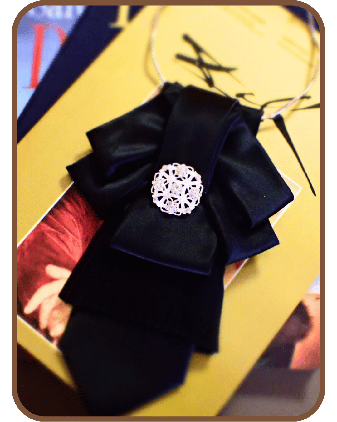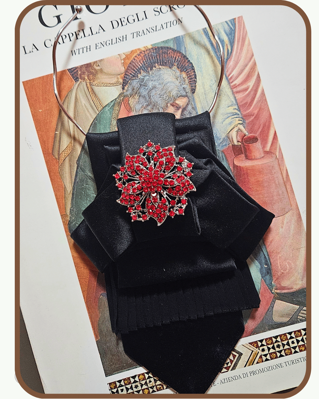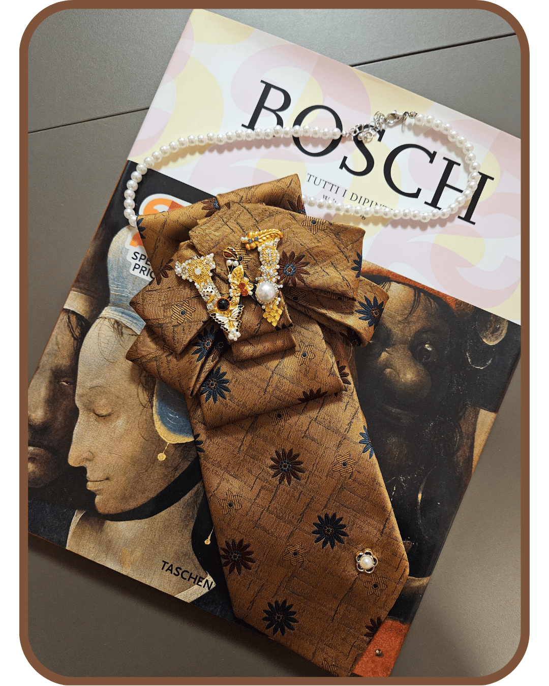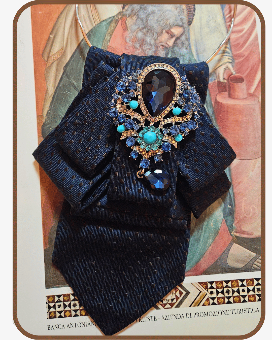 Cravatta in pura seta anni ‘90 con collana rigida, accorciata con pieghe e arricchita con spilla in stile barocco.