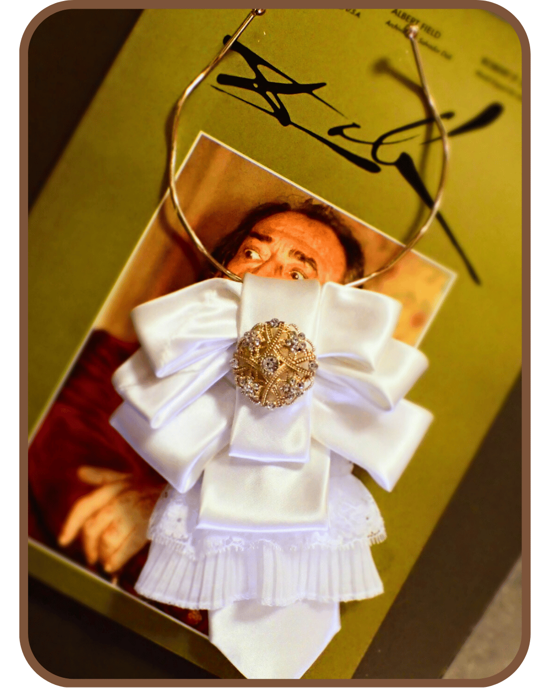 Cravatta in pura seta anni ‘90 con collana rigida, accorciata con pieghe e l’inserimento di un polsino di recupero, arricchita con spille in stile barocco.