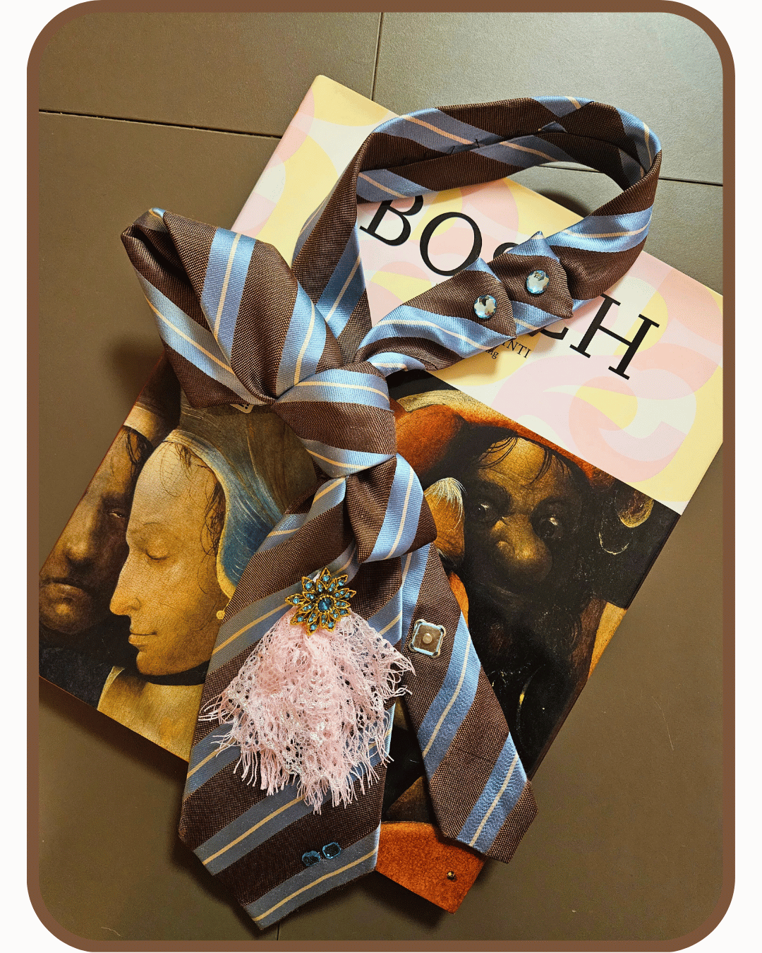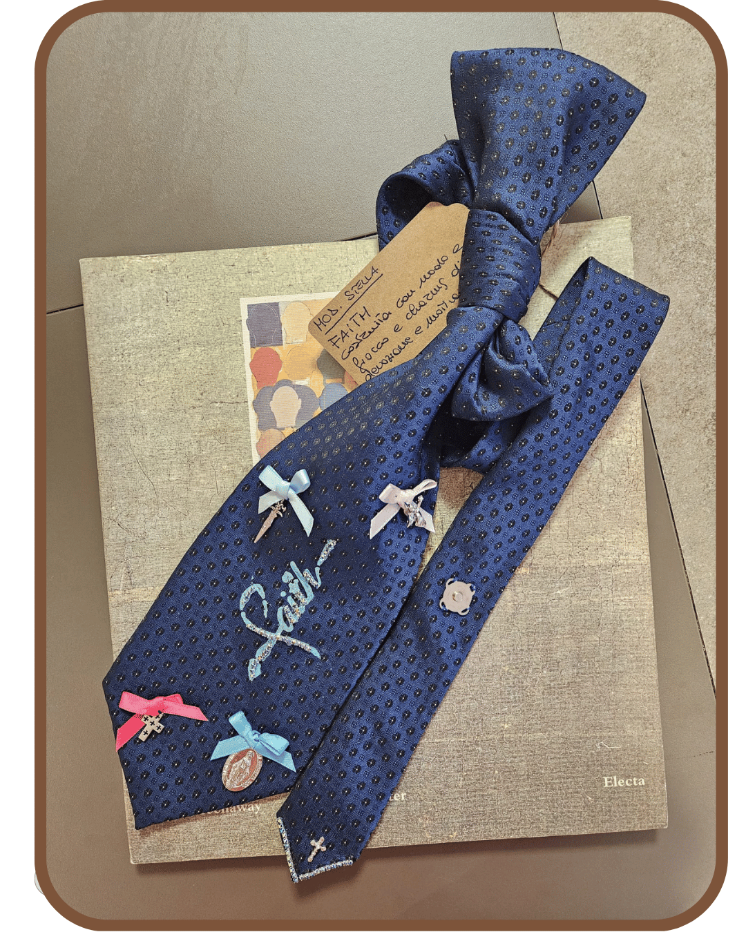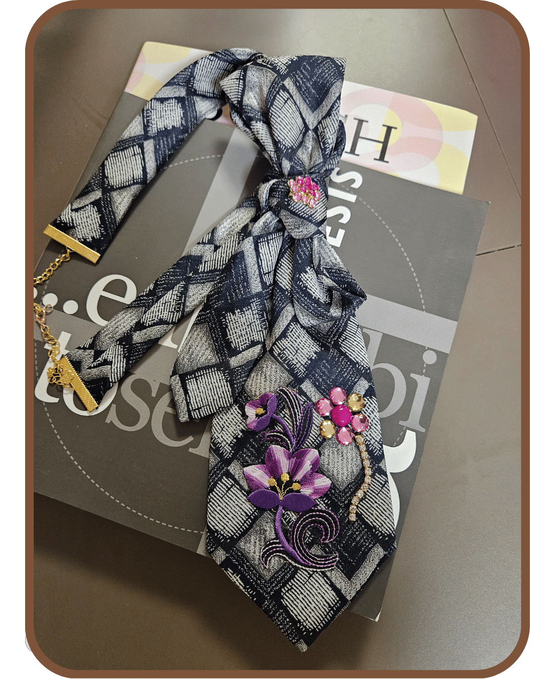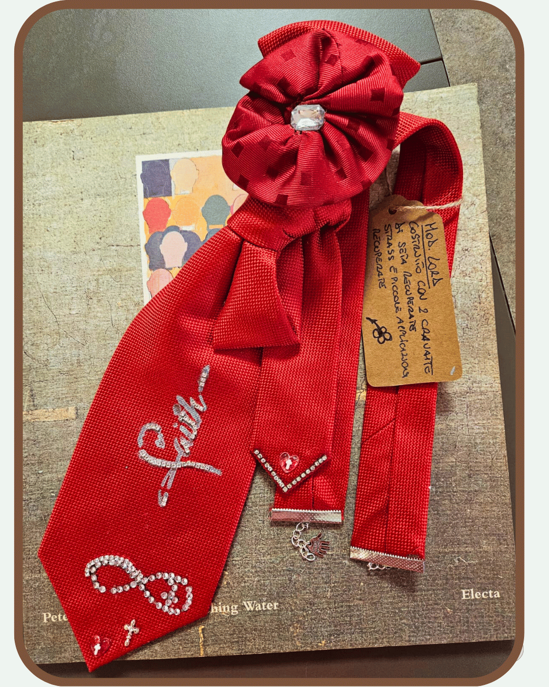 Cravatta anni ‘80 ricamata su disegno acrilico a forma di serpente con oltre 100 spille da balia in metalli e forme diverse e strass. Richiama suggestioni punk, dada e tribali, ma soprattutto evoca un messaggio da portare sulla pelle, quello di un’identità in divenire, fluida, potente e creativa. Selezionata al Premio Maestri a Pechino, presentata in videoproiezione al Museo Three Shadows Photography Art Centre di Pechino dal 24 al 29 Giugno 2025.