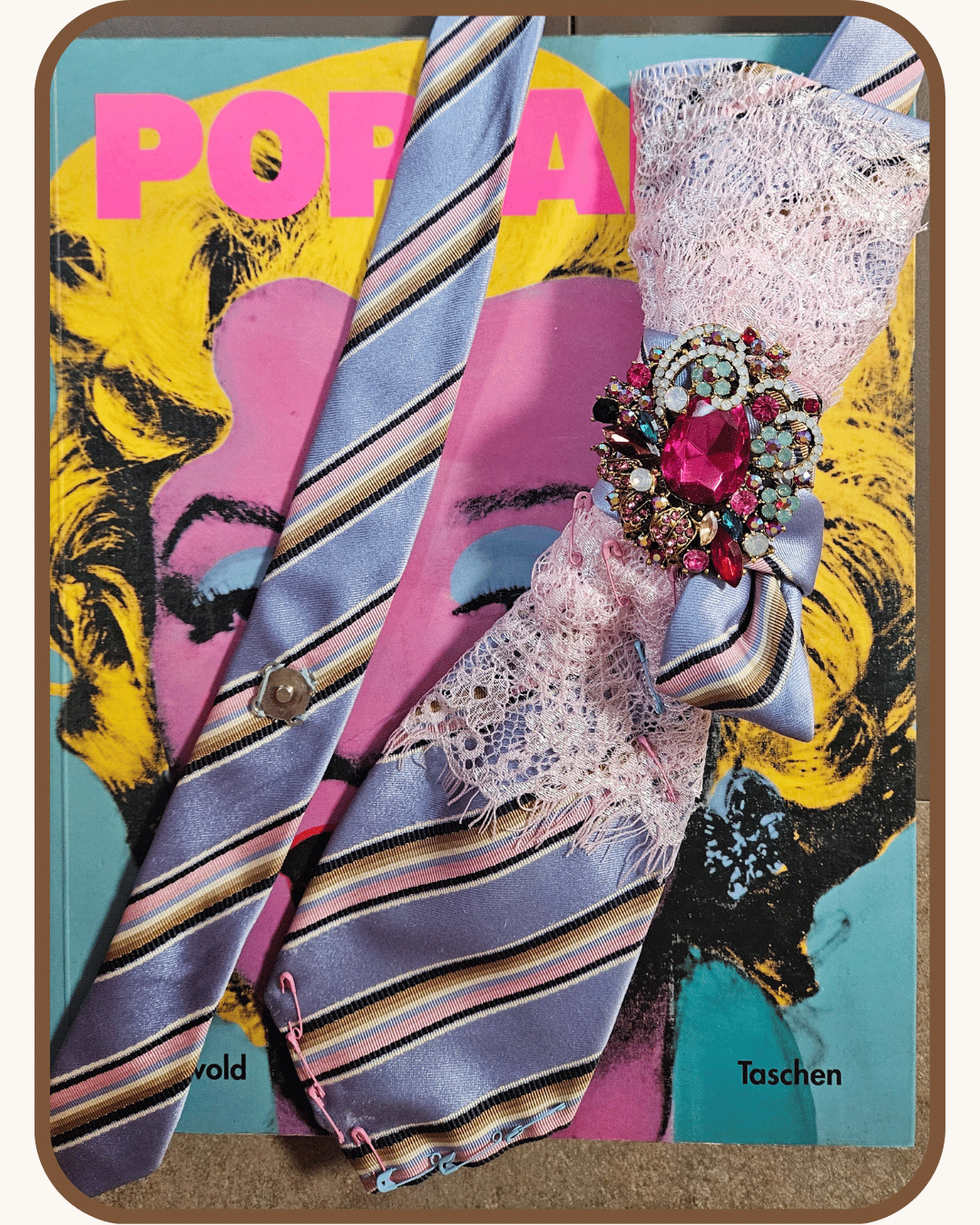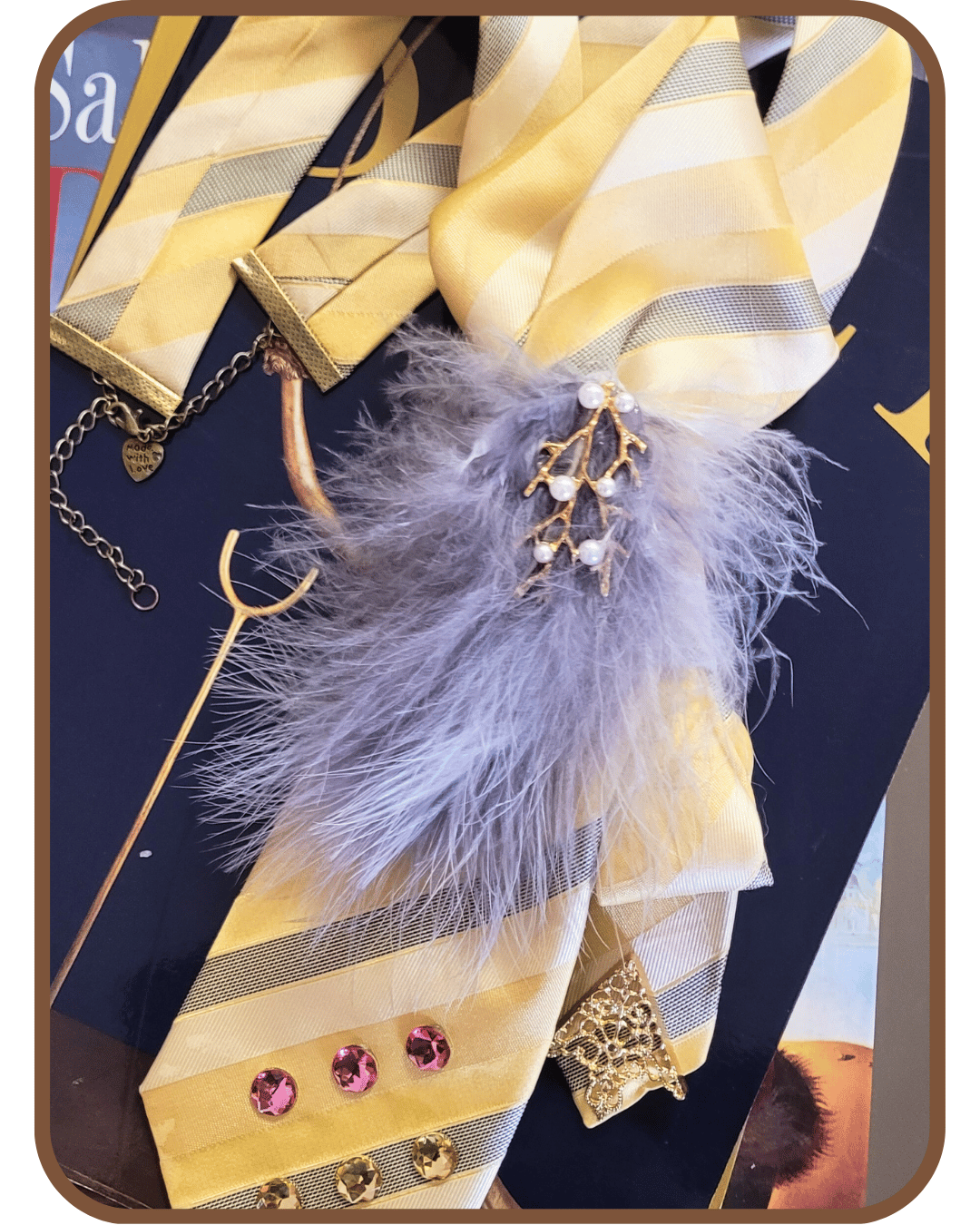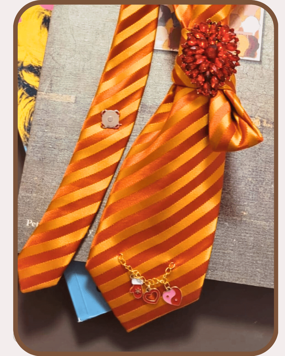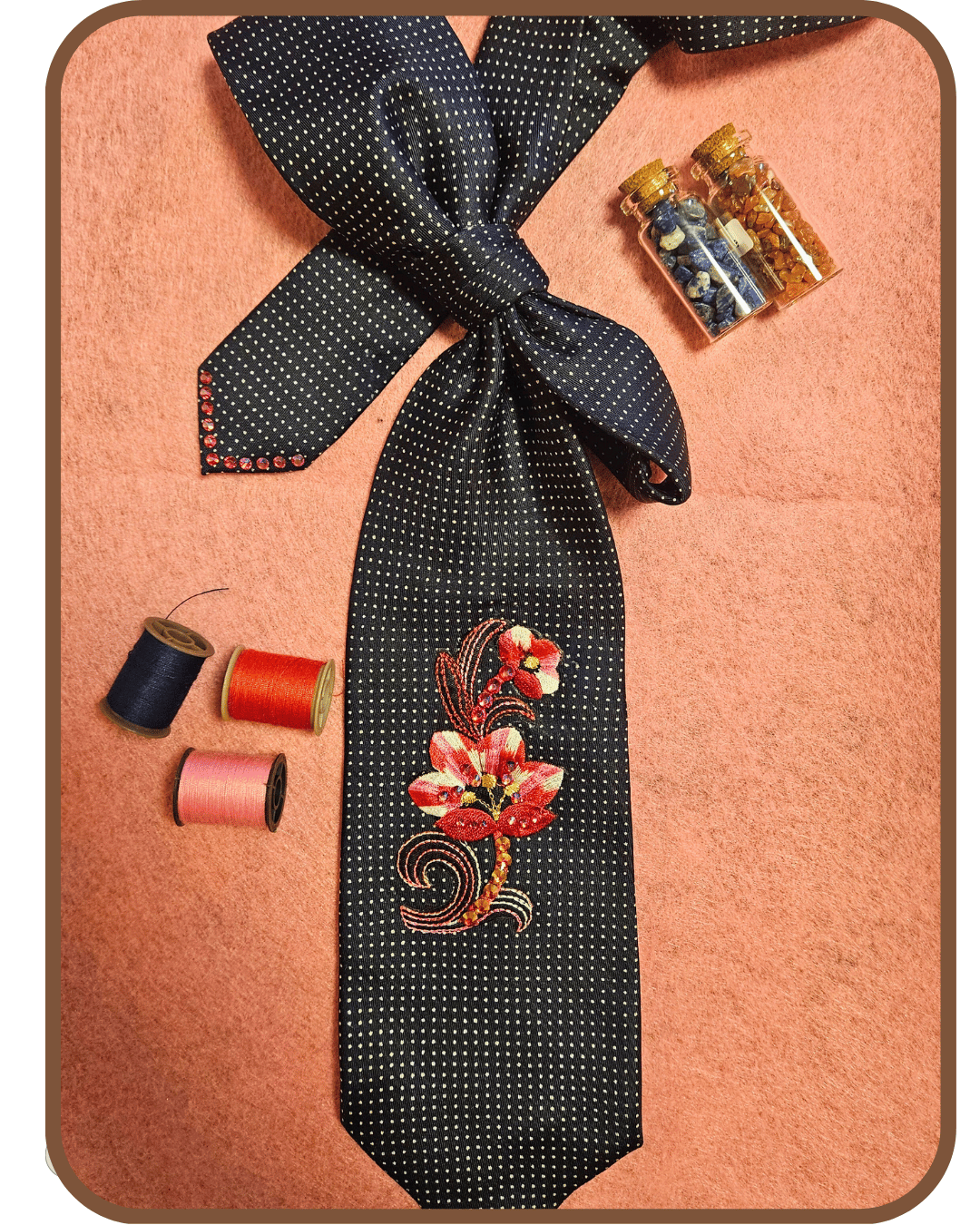Cravatta anni ‘80 ricamata su disegno acrilico a forma di serpente con oltre 100 spille da balia in metalli e forme diverse e strass. Richiama suggestioni punk, dada e tribali, ma soprattutto evoca un messaggio da portare sulla pelle, quello di un’identità in divenire, fluida, potente e creativa. Selezionata al Premio Maestri a Pechino, presentata in videoproiezione al Museo Three Shadows Photography Art Centre di Pechino dal 24 al 29 Giugno 2025.