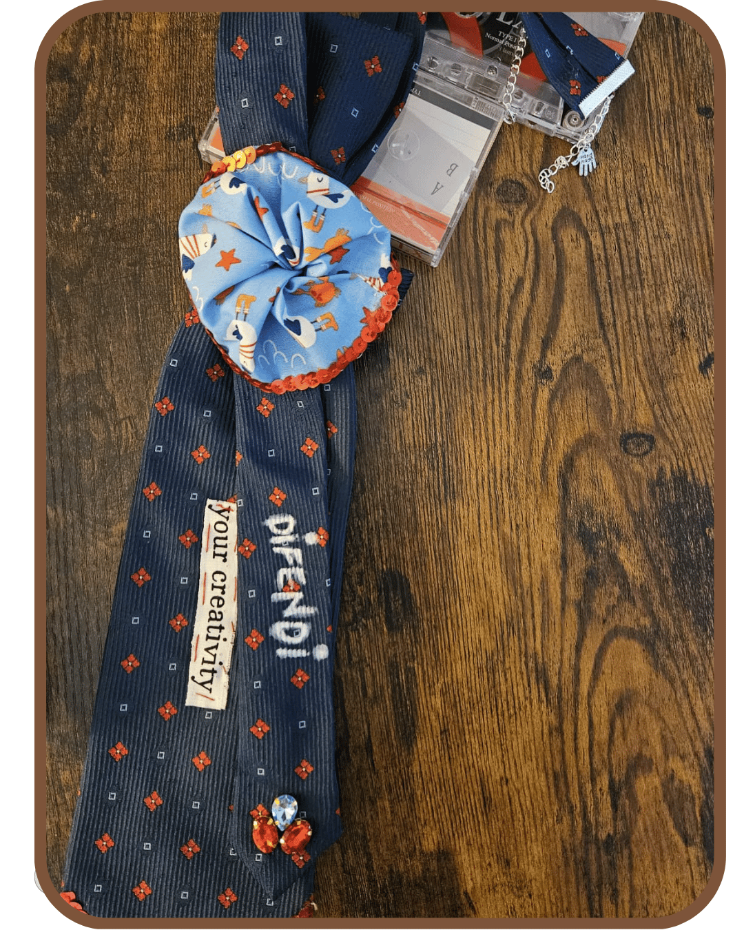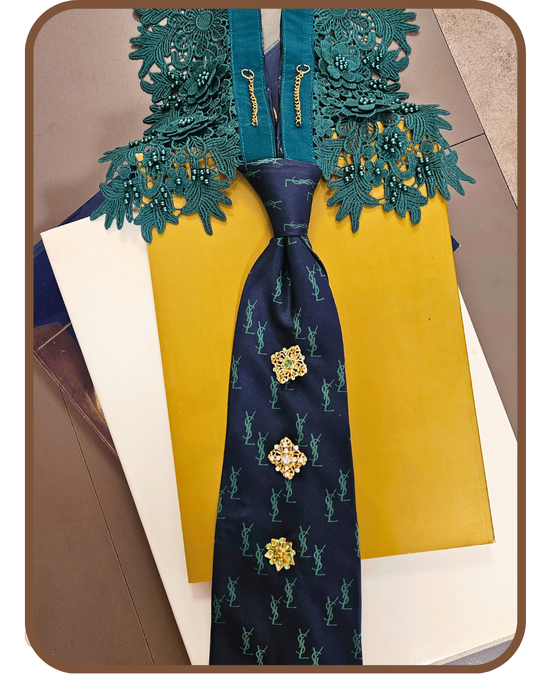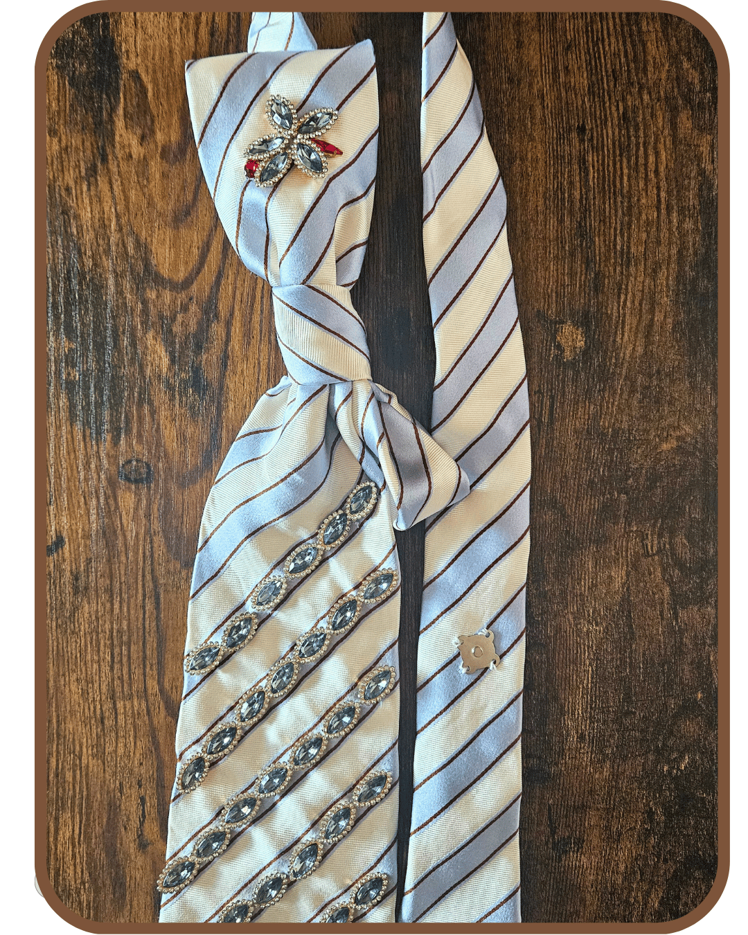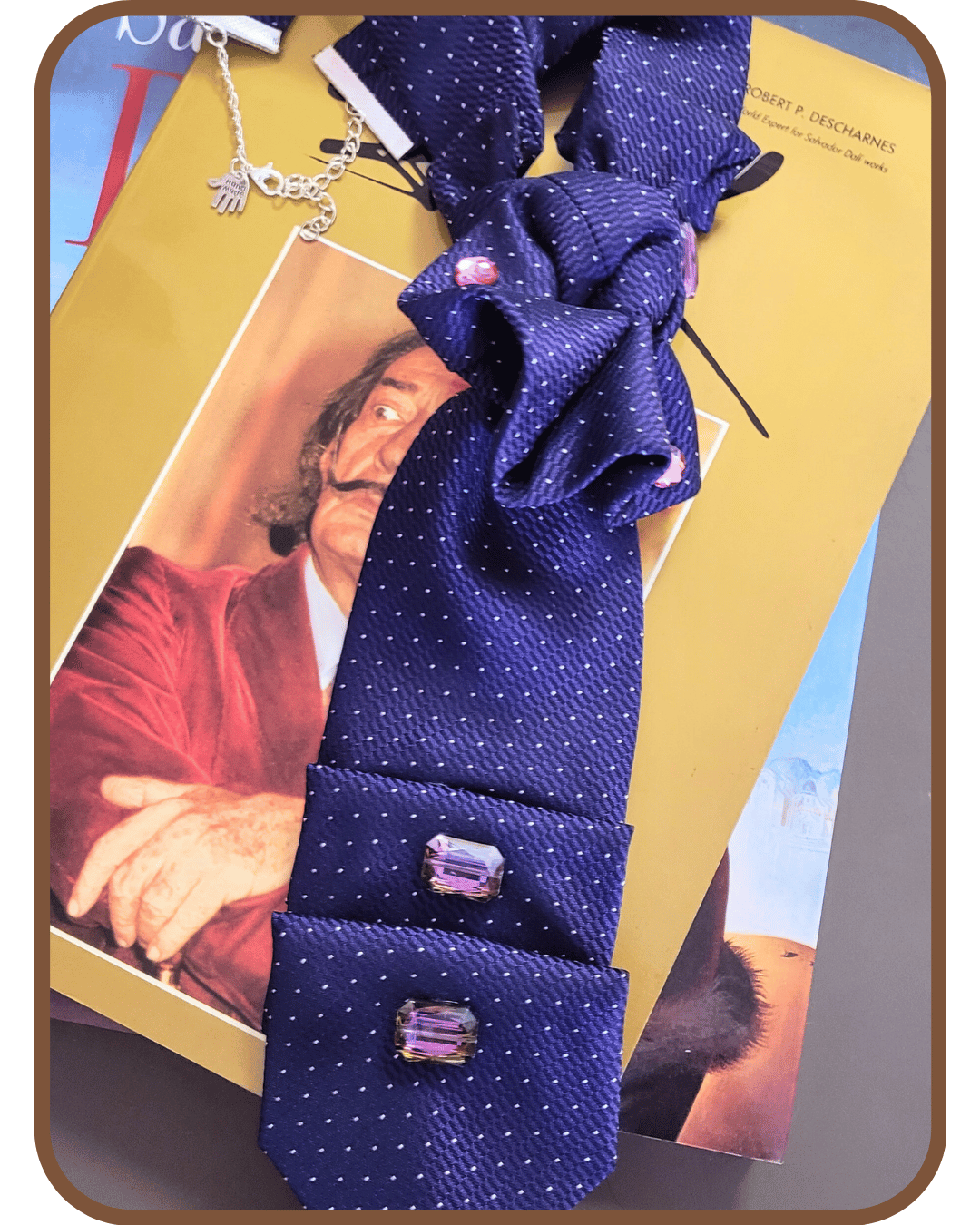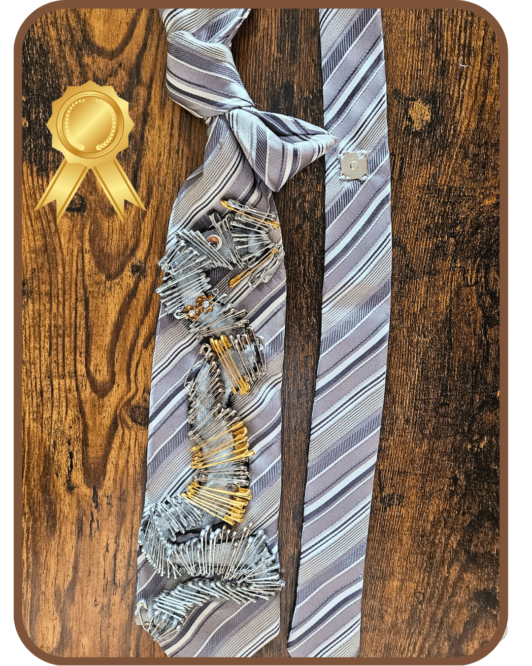 Cravatta anni ‘80 ricamata su disegno acrilico a forma di serpente con oltre 100 spille da balia in metalli e forme diverse e strass. Richiama suggestioni punk, dada e tribali, ma soprattutto evoca un messaggio da portare sulla pelle, quello di un’identità in divenire, fluida, potente e creativa. Selezionata al Premio Maestri a Pechino, presentata in videoproiezione al Museo Three Shadows Photography Art Centre di Pechino dal 24 al 29 Giugno 2025.