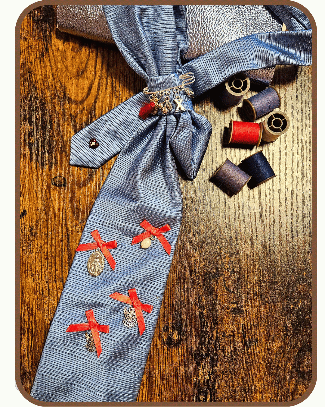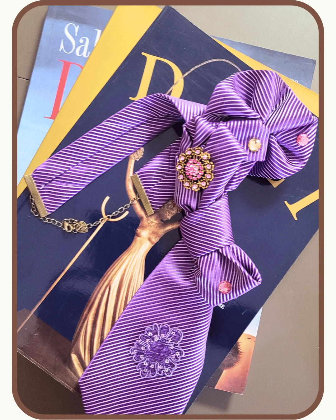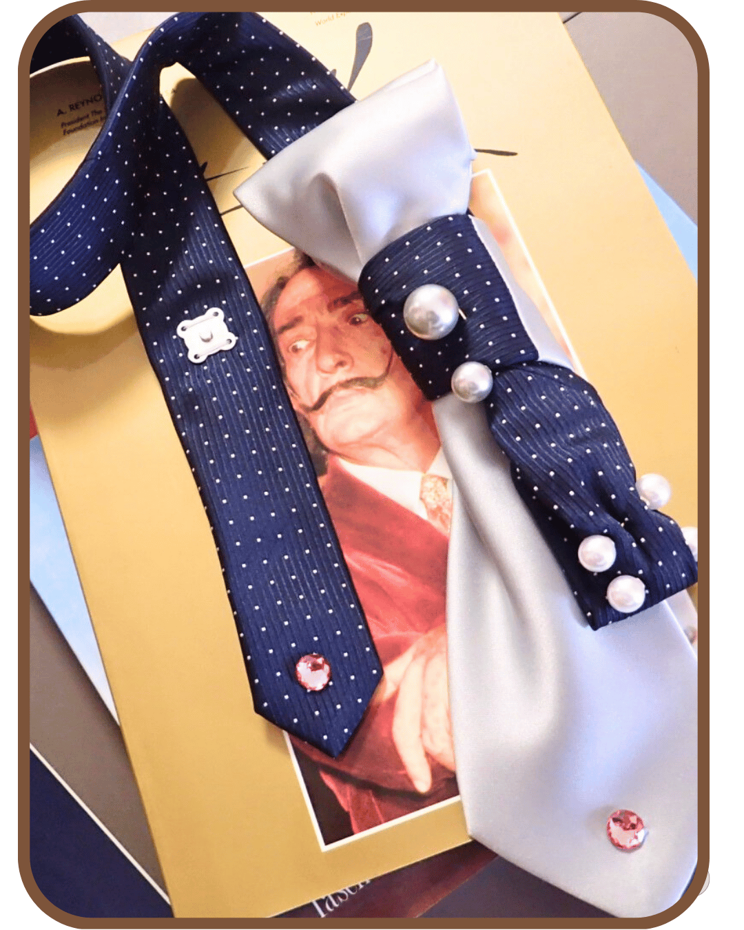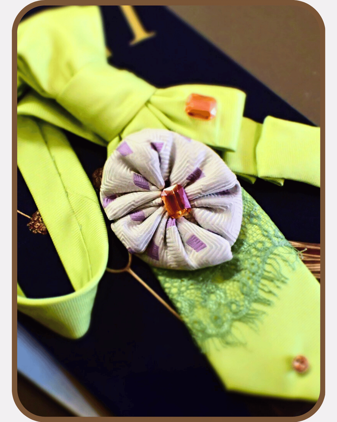 Cravatta anni ‘80 ricamata su disegno acrilico a forma di serpente con oltre 100 spille da balia in metalli e forme diverse e strass. Richiama suggestioni punk, dada e tribali, ma soprattutto evoca un messaggio da portare sulla pelle, quello di un’identità in divenire, fluida, potente e creativa. Selezionata al Premio Maestri a Pechino, presentata in videoproiezione al Museo Three Shadows Photography Art Centre di Pechino dal 24 al 29 Giugno 2025.
