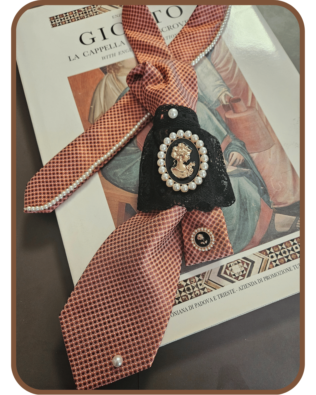 Pura seta impalpabile anni ‘70 costruita con fiocco e accorciata come un cravattino, con pala sul davanti e applicazioni in perle e cameo antichizzato.