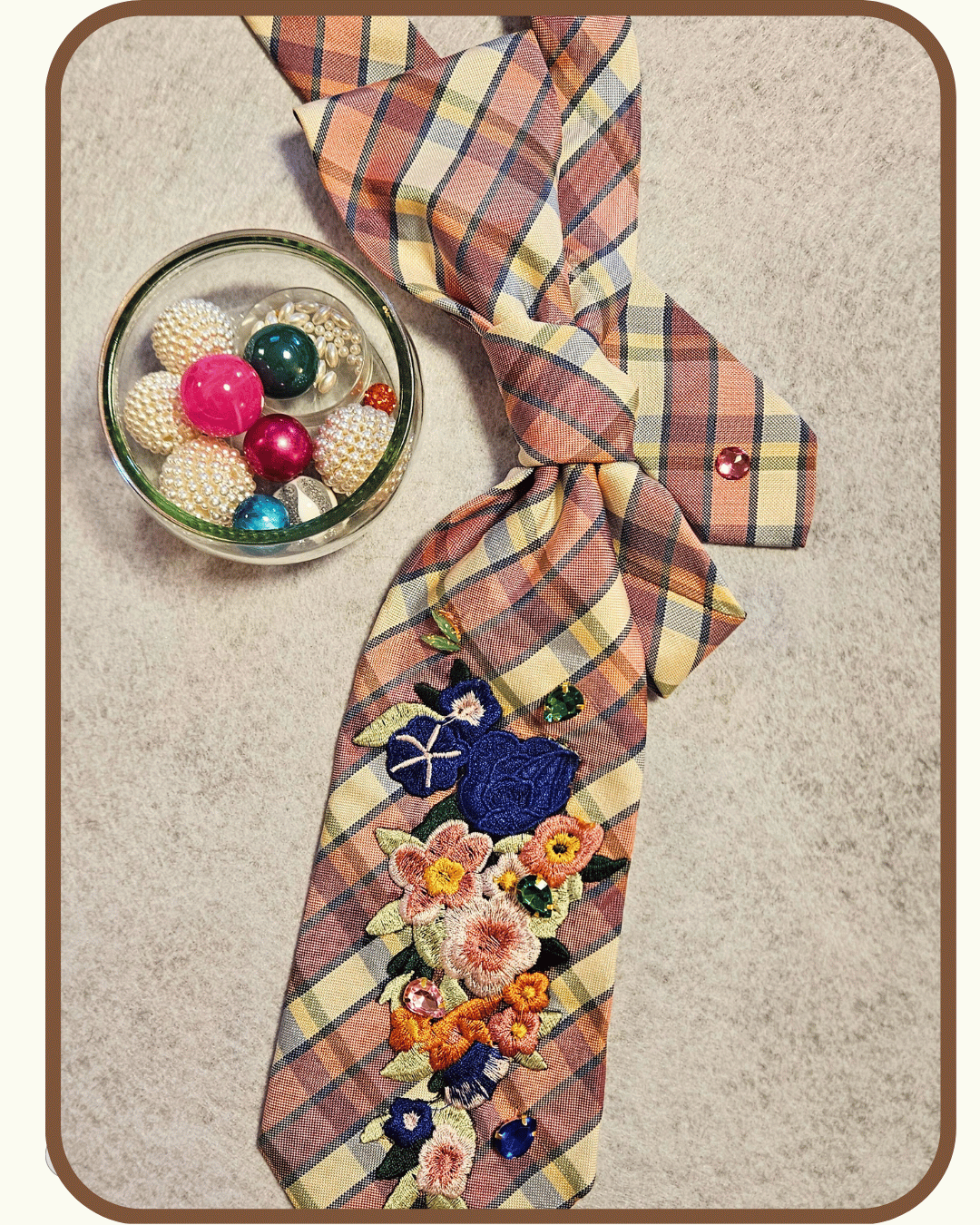 Pura seta primi anni ‘90 con fantasia tartan bon ton, decorata con patch in filo di recupero e cucita con strass. Per chi ama i tocchi delicati e leggeri anche nei capi da ufficio.