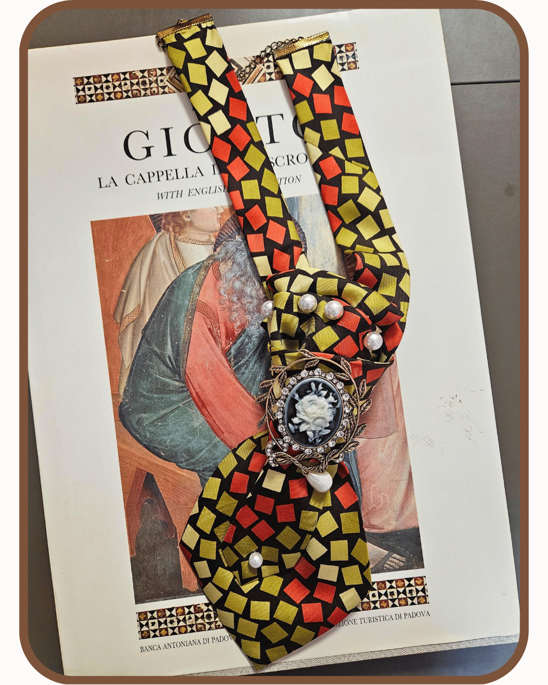 Pura seta made in Italy anni 2000 decorata con charms su catena e spilla barocca. Per chi vuole la luce nella parte alta del proprio outfit.