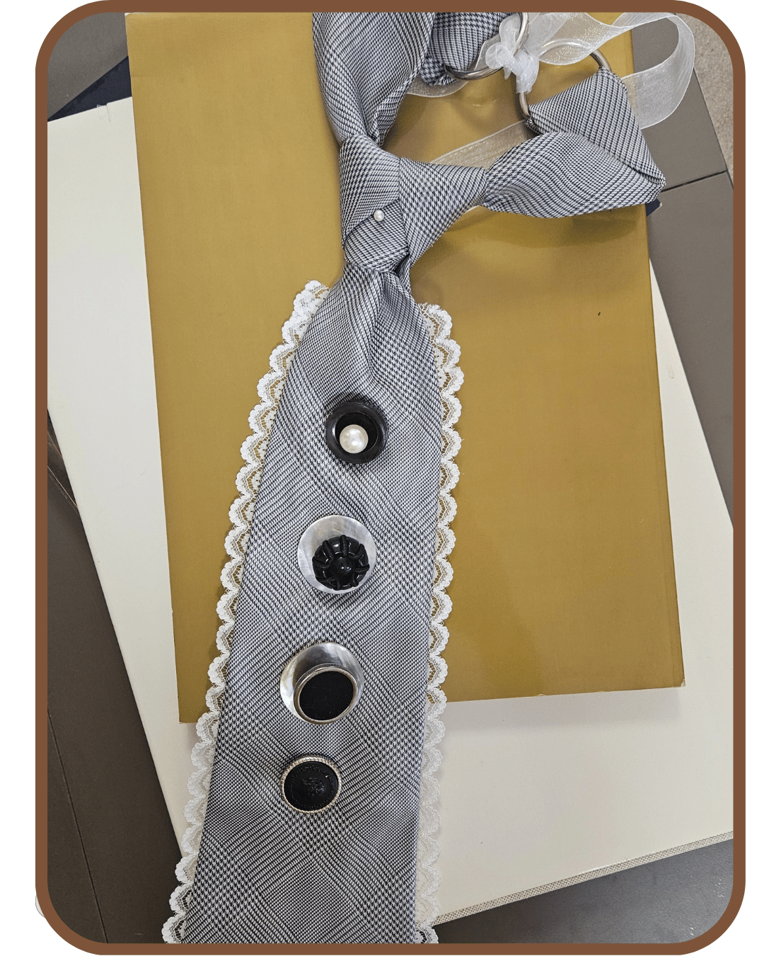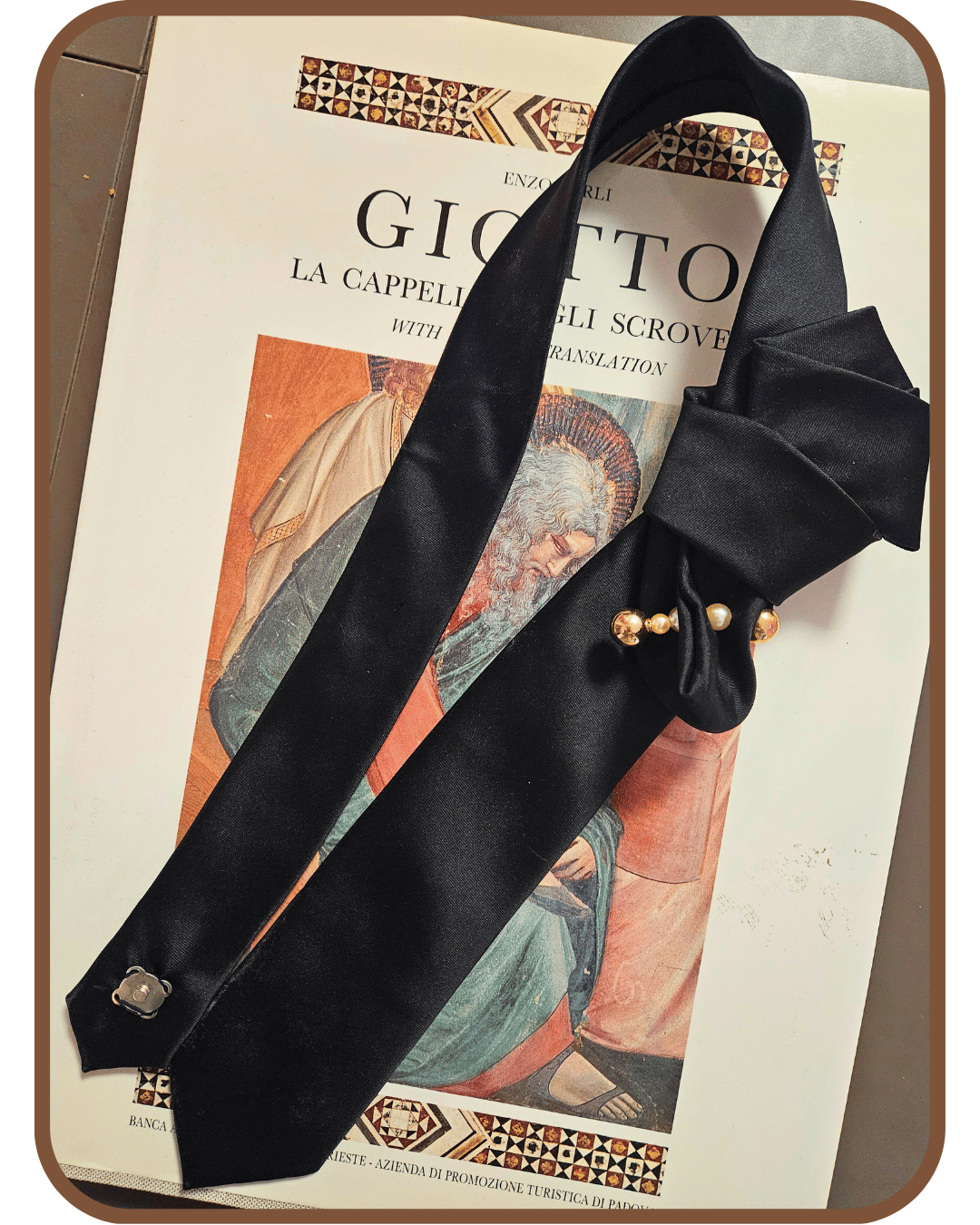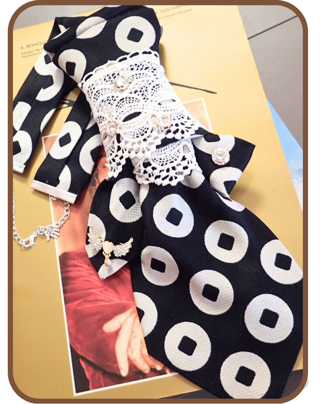 Pura seta, Principe di Galles anni ‘90 costruita con un nodo trinity, bordata in pizzo, con doppi bottoni vintage in madreperla anni ‘60-’70 e chiusura con anelli di borsa e fiocco in organza, per rendere unico un semplice outfit con blazer.