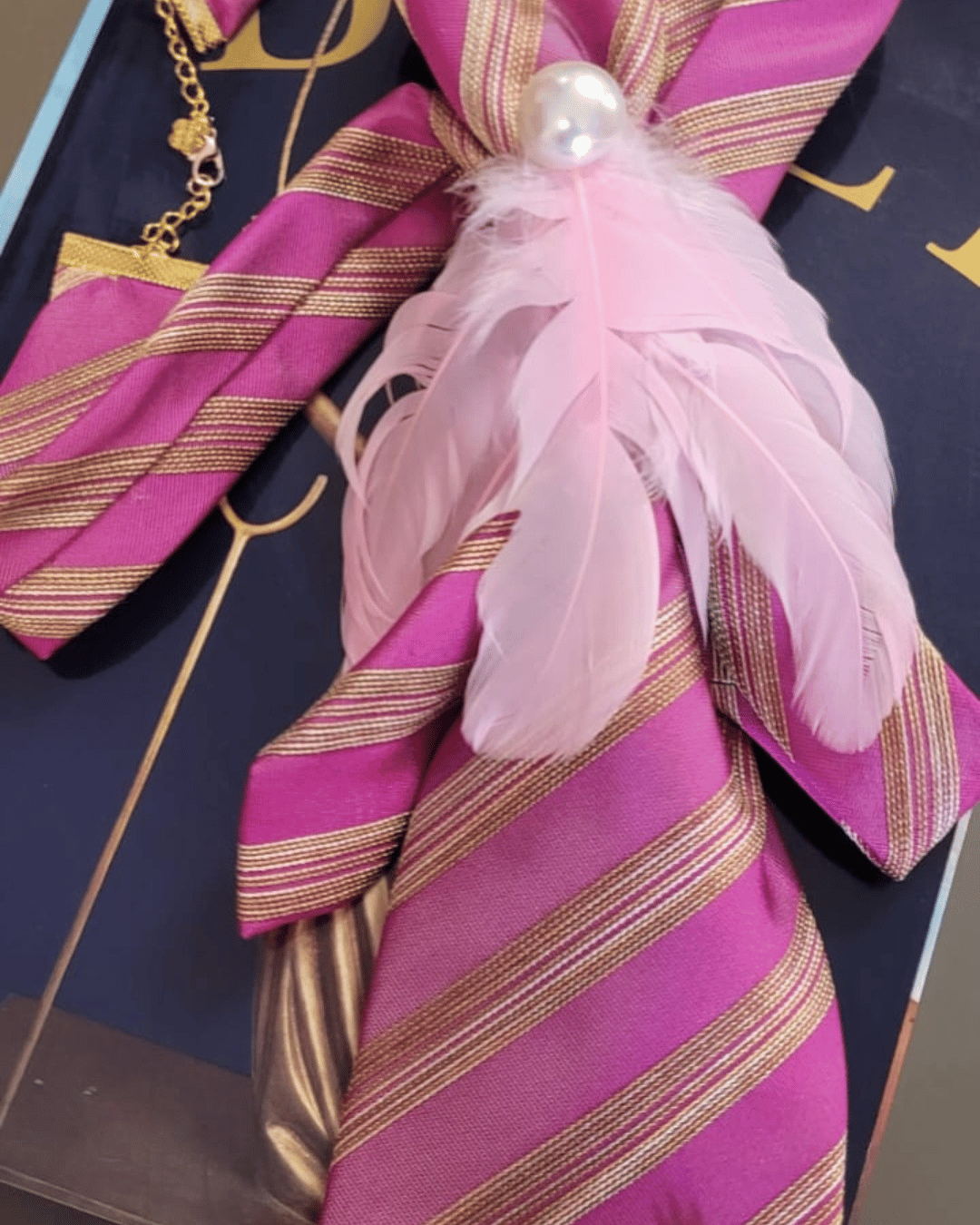 Un classico anni ‘80 rivisitato con la costruzione di pieghe al posto del nodo e spilla di perle.
