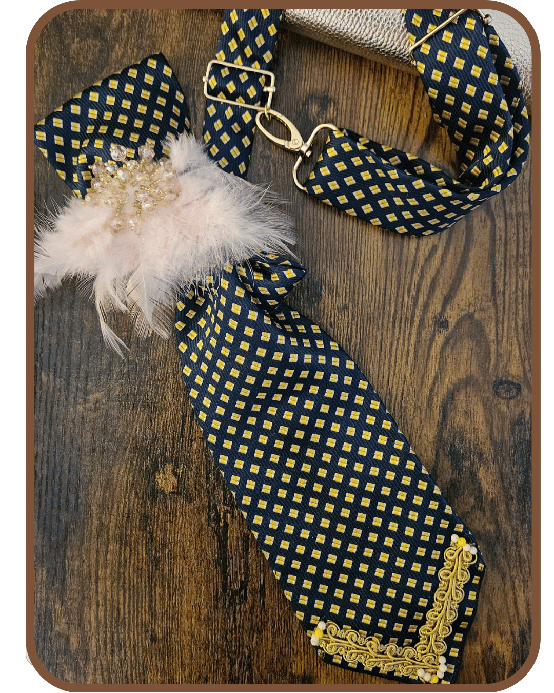 Burberry di fine anni ‘90 in pura seta rivisitata in chiave ribelle con un nodo trinity. L’iconico motivo check diventa tela di un ricamo a mano di strass e perline di vetro, e di un collage di scarto di pelle maculato per creare un contrasto visivo e tattile. Fibbie sottratte alle borse diventano chiusure sovversive e funzionali.