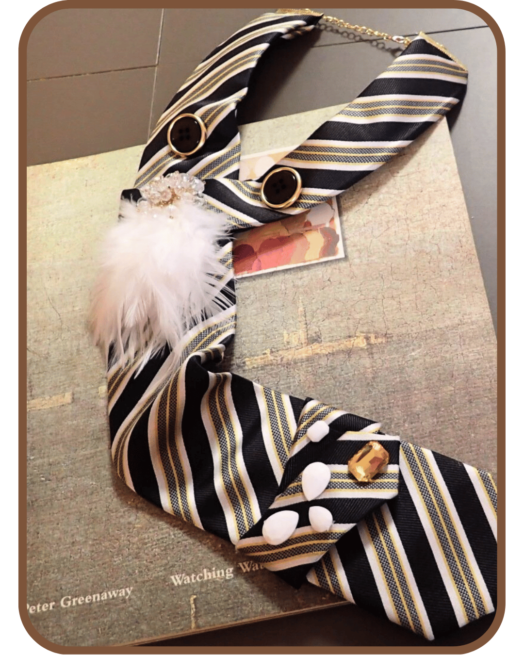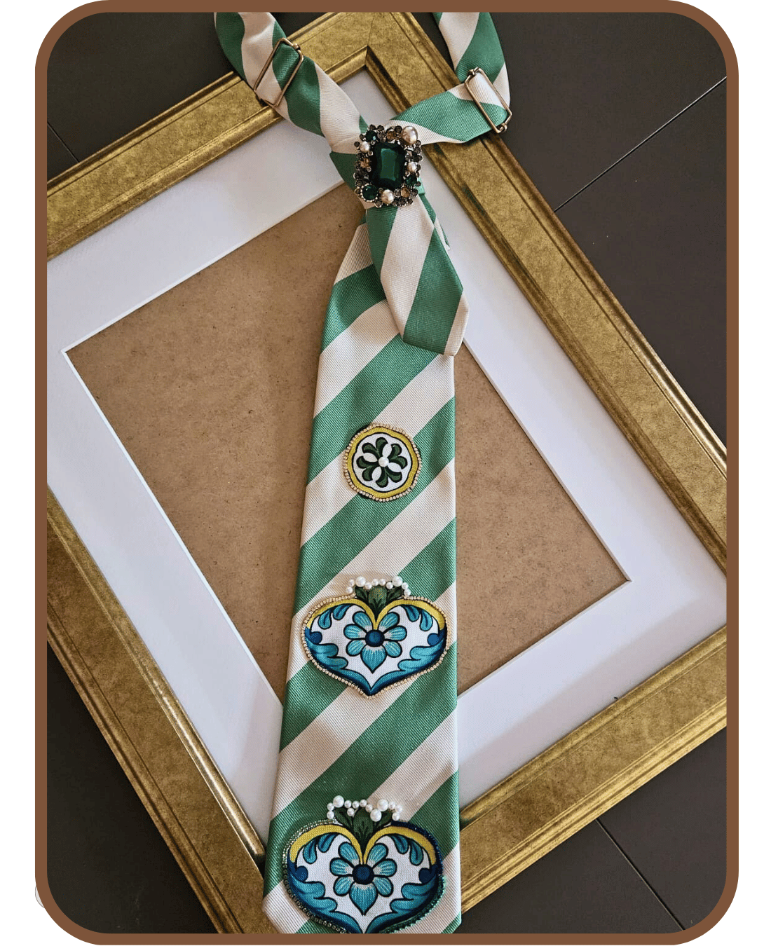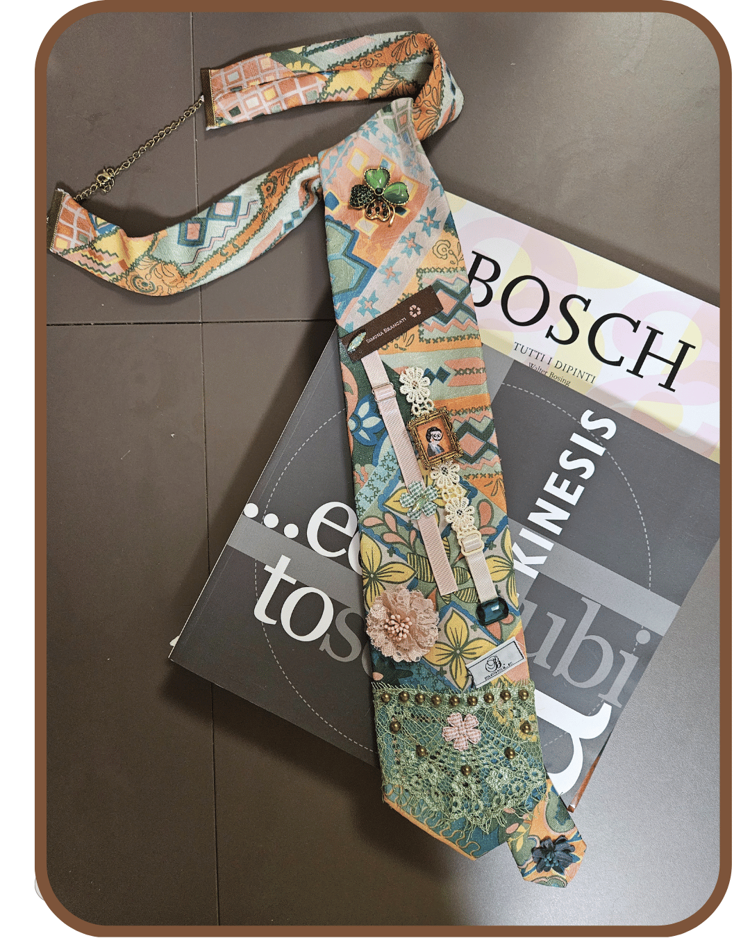 Basile in pura seta anni ‘70 con applicazioni in parte recuperate di fiori, strass, borchie, pizzo, spalline di reggiseno spilla retrò e miniature. La cravatta si trasforma in tela surrealista da indossare con ironia.