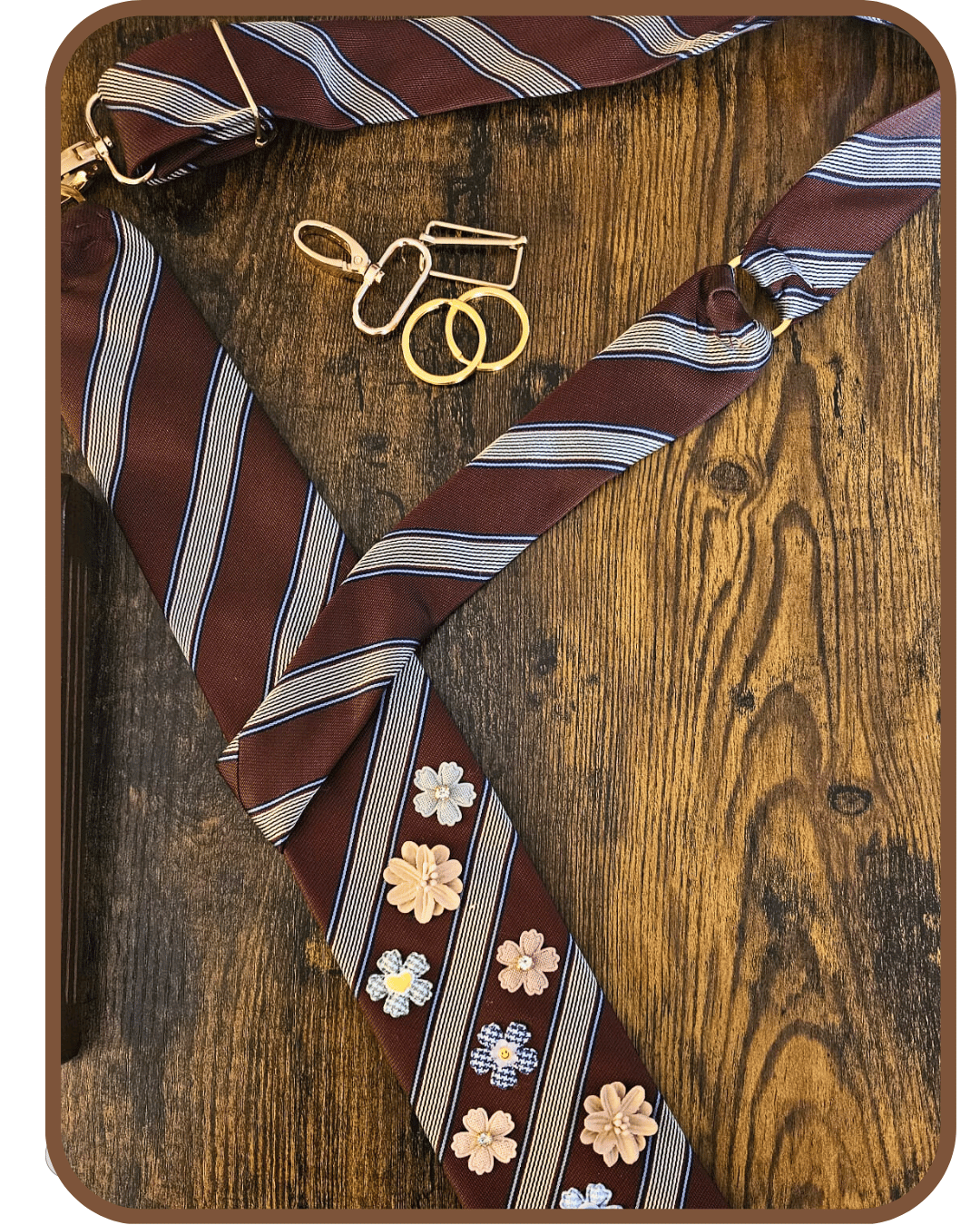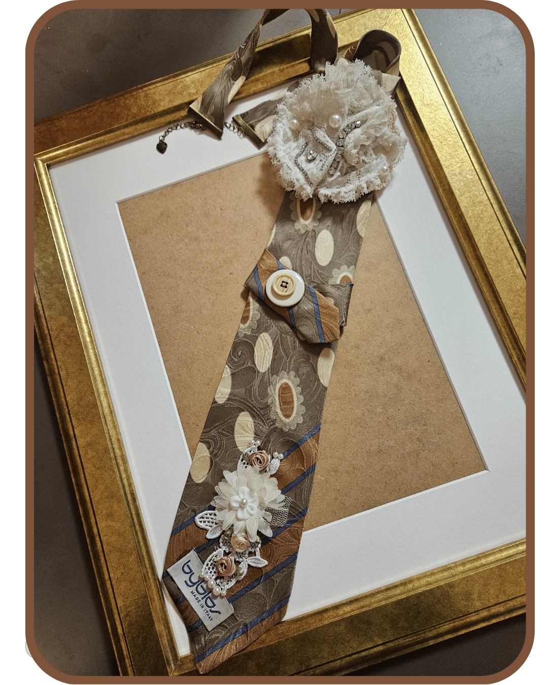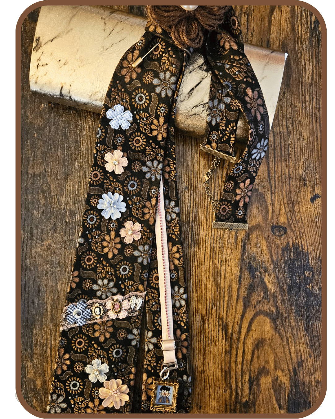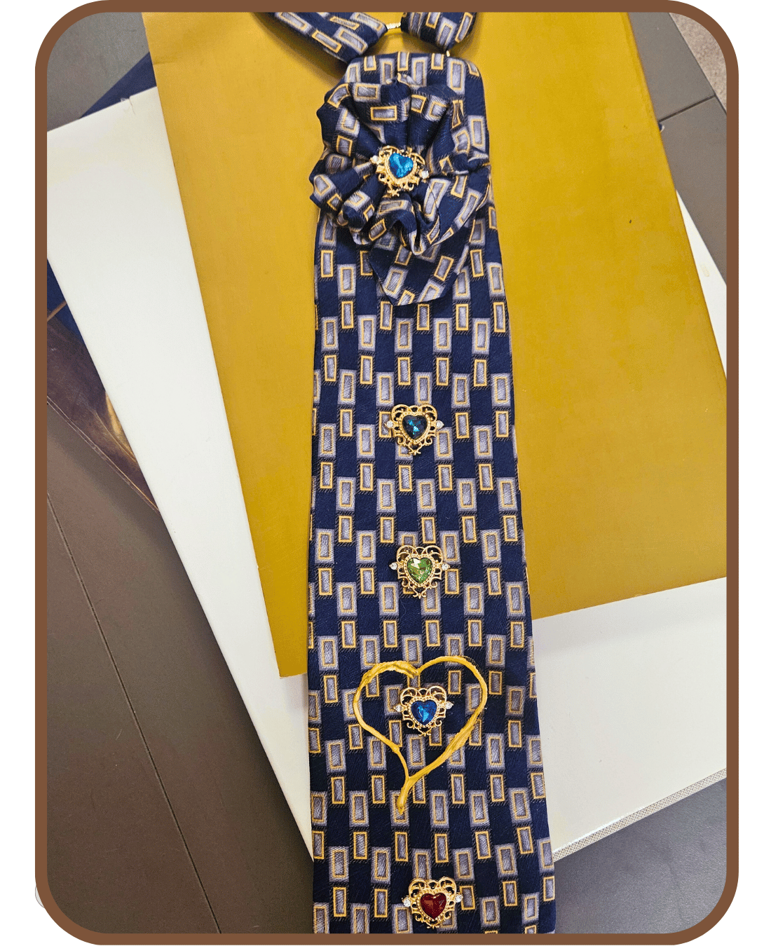 Basile in pura seta anni ‘70 con applicazioni in parte recuperate di fiori, strass, borchie, pizzo, spalline di reggiseno spilla retrò e miniature. La cravatta si trasforma in tela surrealista da indossare con ironia.