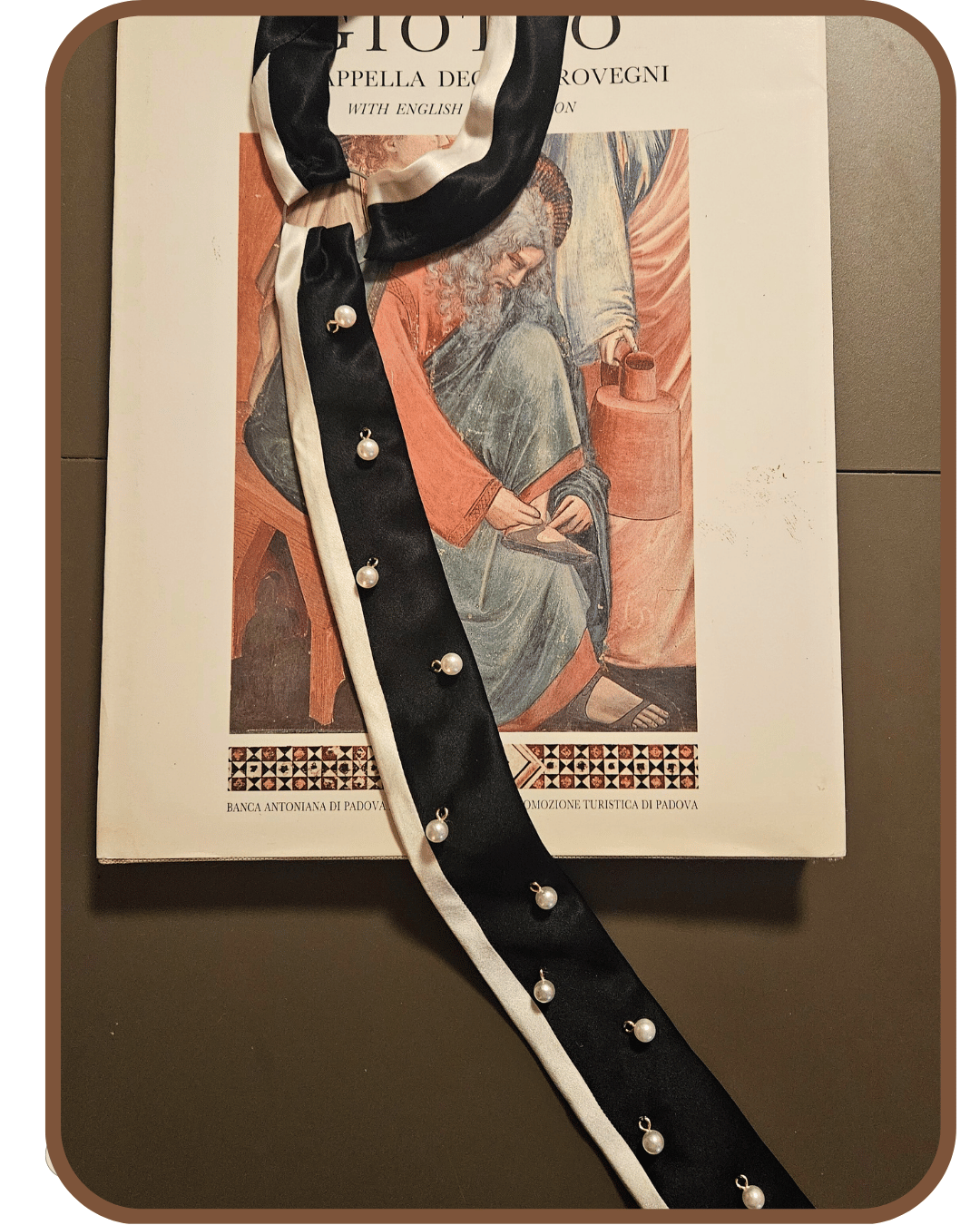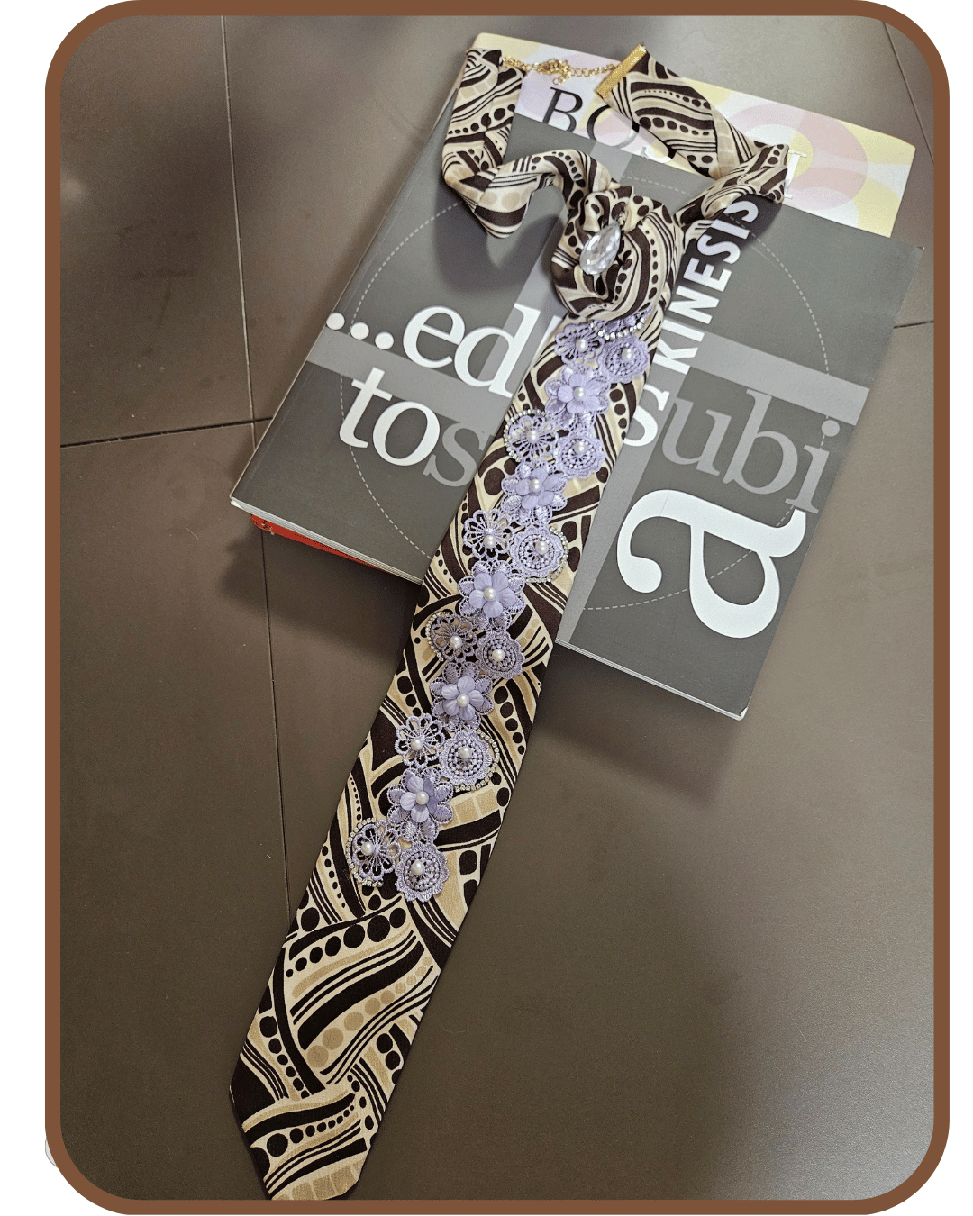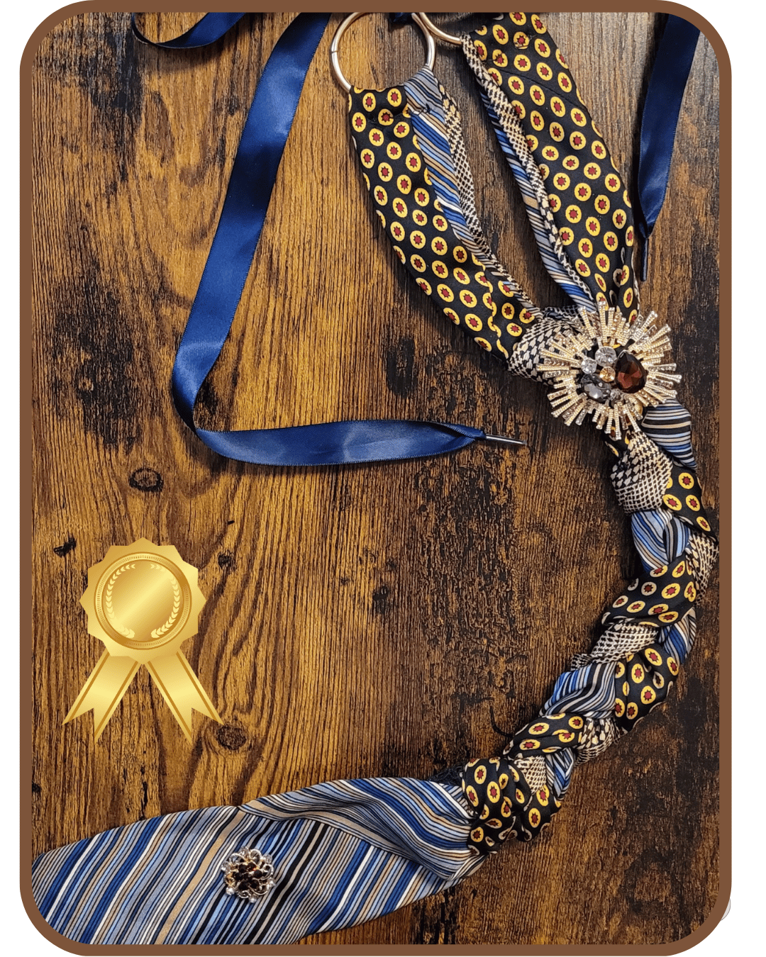 Tre cravatte vintage in seta (G. Armani ‘80 e YSL ‘70) fuse in una scultura indossabile chiusa con anelli delle borse e stringhe di scarpe. Ispirata alla treccia surrealista di Elsa Schiaparelli. Riconoscimento Internazionale Arti Visive Giotto presso Palazzo Borghese di Firenze, 14 giugno 2025, pubblicazione su catalogo.