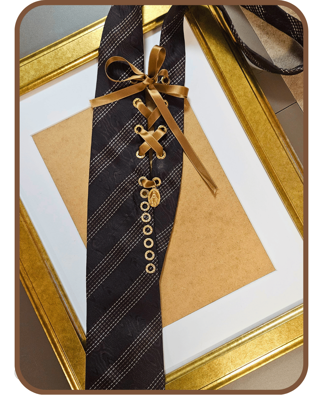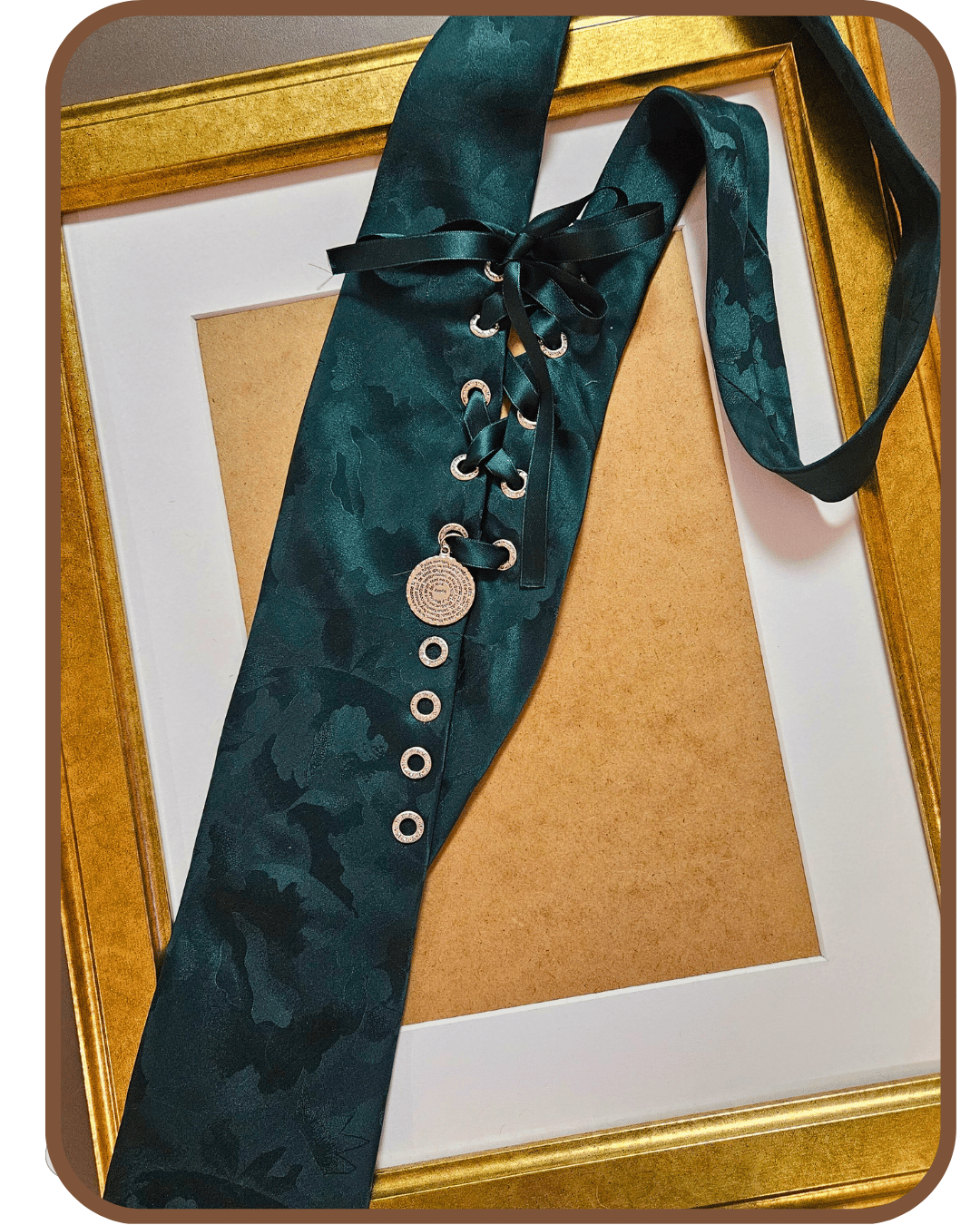 Seta vintage a pala larga che riproduce un corsetto con nastri di raso, rivetti in strass e charm di protezione, per raccontare qualcosa di sè a piccole dosi. E’ la cravatta ideale per vestire seni generosi e impreziosire camicie e bluse con scollature molto profonde o senza colletti.