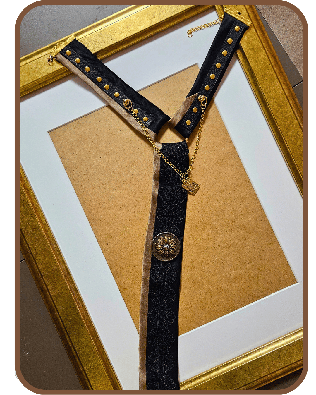 Tom Harrison in pura seta vintage. Costruita con collo mobile in tre parti con anello centrale, ricamata con acrilico e fregi di cuore sacro. Si indossa anche come un choker sul collo nudo per un’allure dark.